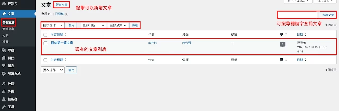 - 「全部文章」:這邊可以查看目前所有的文章列表, 可以編輯、查看、快速編輯或複製文章等等…